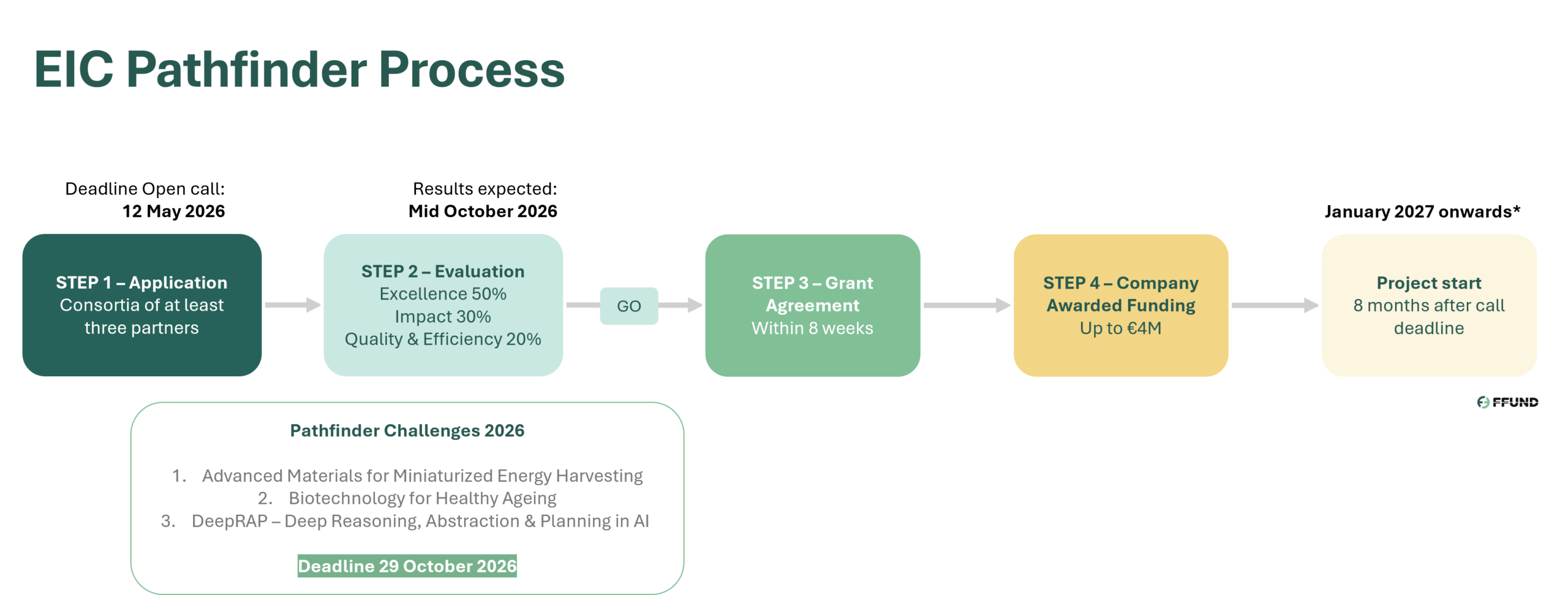 It is the instrument of choice for ideas that are too bold, too exploratory, or too unconventional to fit within traditional research schemes, but have innovative deep-tech potential nonetheless. EIC’s Pathfinder differentiates between Open (A) calls and calls for specific themes under Challenges (B).