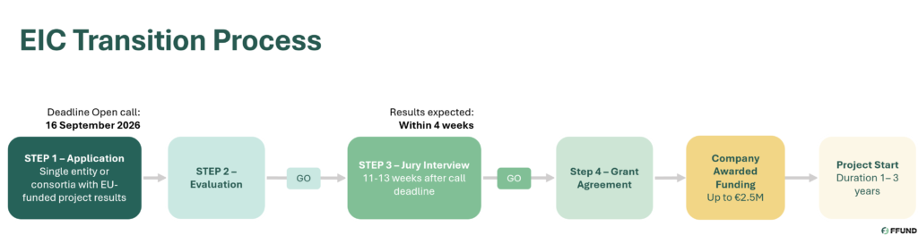 The EIC Transition instrument is aimed at innovations that have research results at TRL 3–4 from eligible EU-funded projects and want to validate the technology (TRL 5–6) and build a business case.